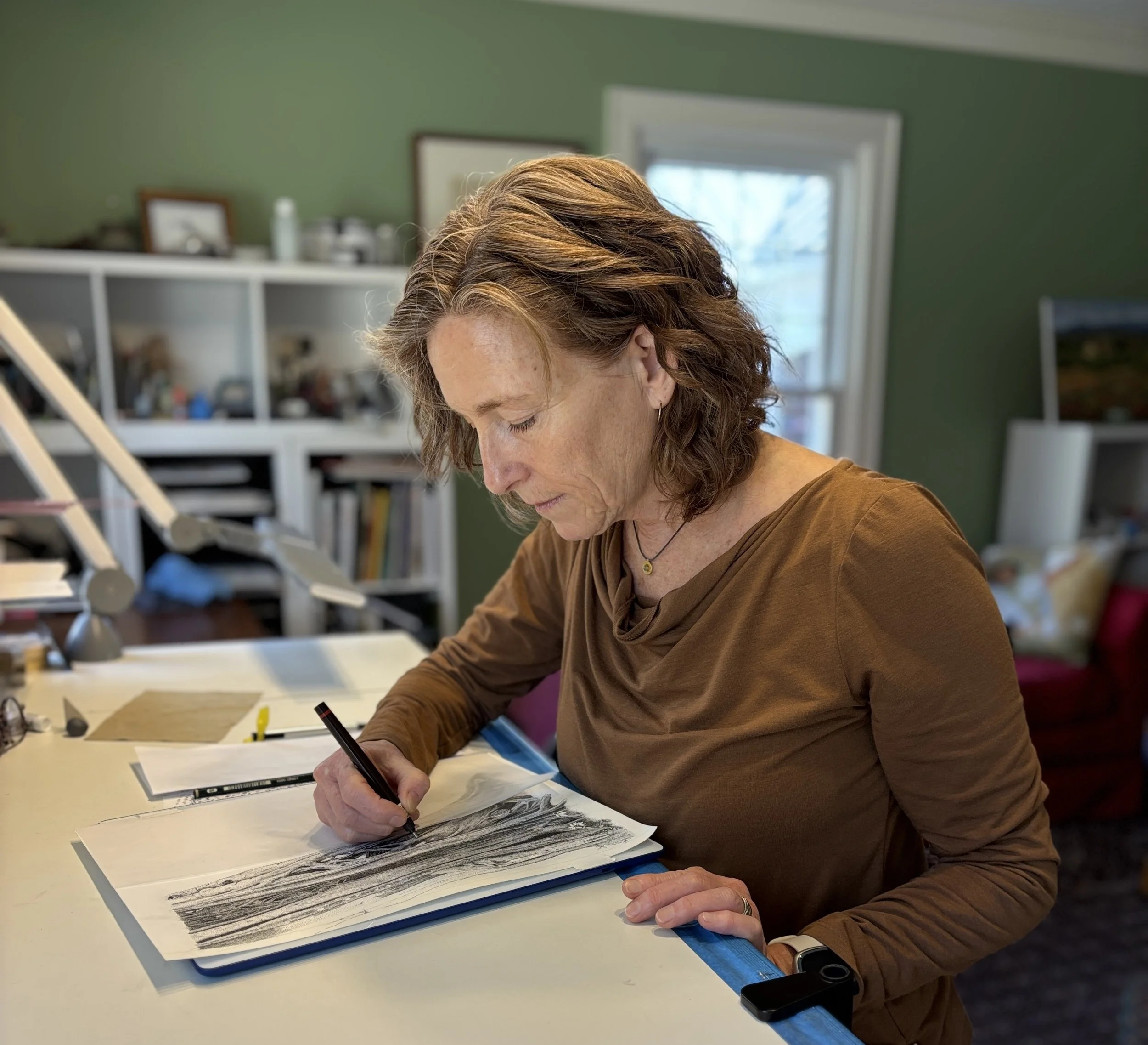I work in graphite, pen and ink, and colored pencil — media that reward patience and precision. Watercolor, with its tendency to wander wherever it pleases, keeps me humble.